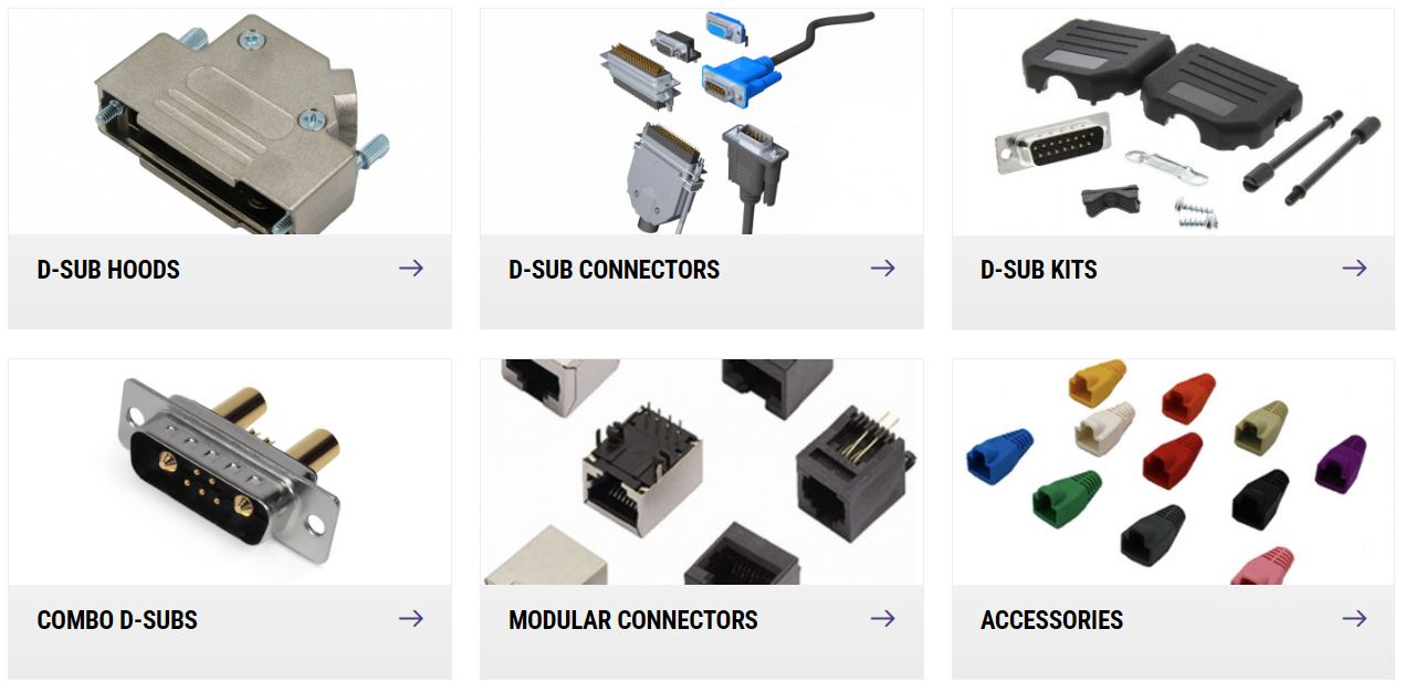 Termékek: D-Sub 9 – 62 érintkezővel dupla vagy tripla sorokban. Moduláris csatlakozók, RJ45, RJ48, RJ11, RJ12, RJ22, Cat5 és Cat6.