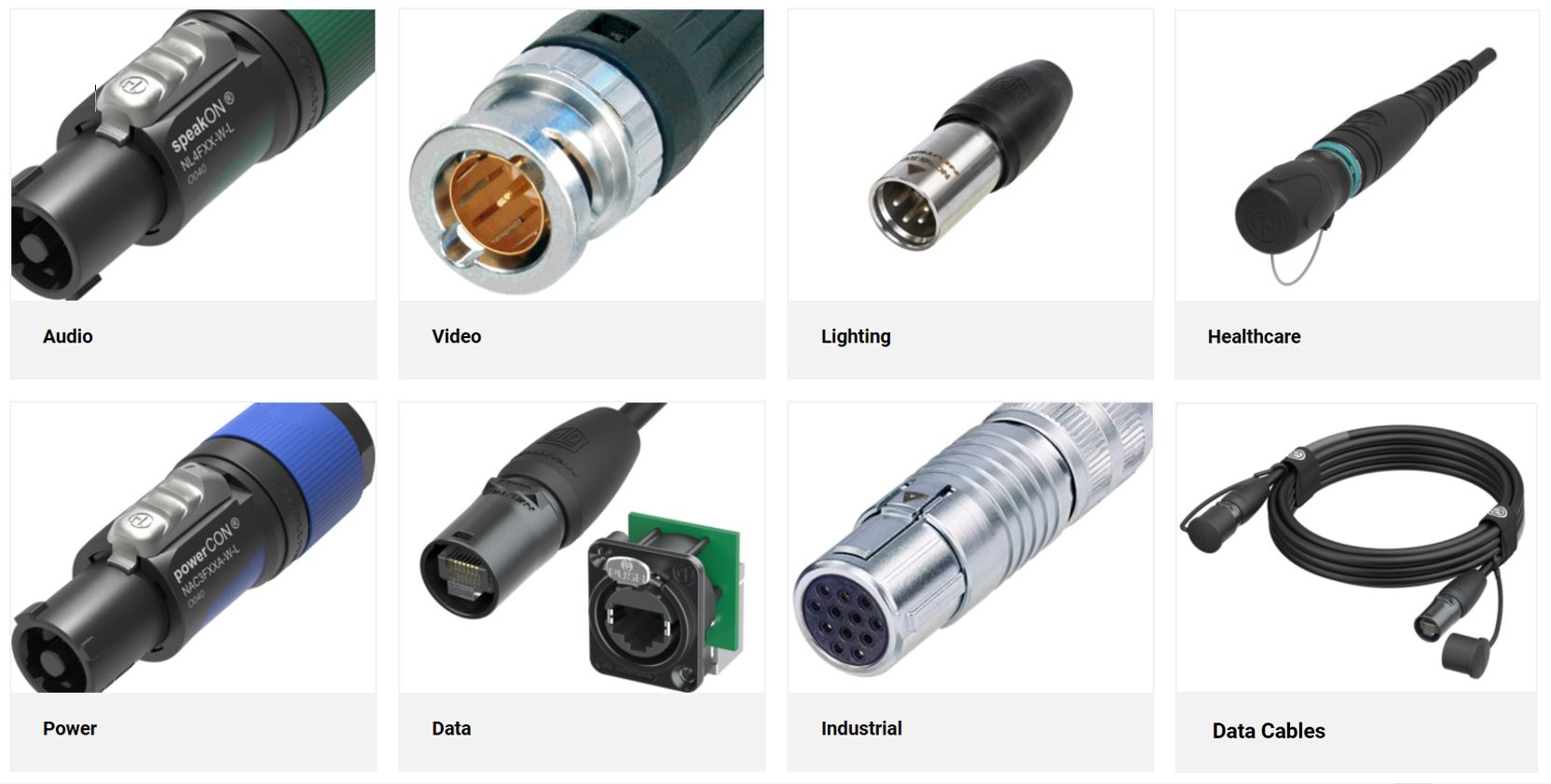Innovatív audio, video, táp és adat csatlakozók, optikai és elektronikus csatlakozók, hálózati eszközök és áramelosztó rendszerek.