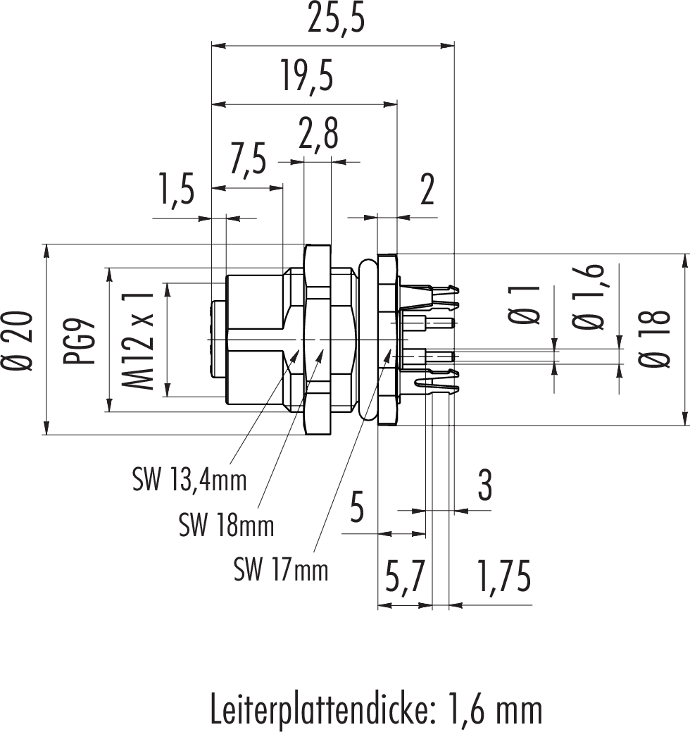 Polzahl: 5, schirmbar, tauchlöten, IP68, UL, PG9