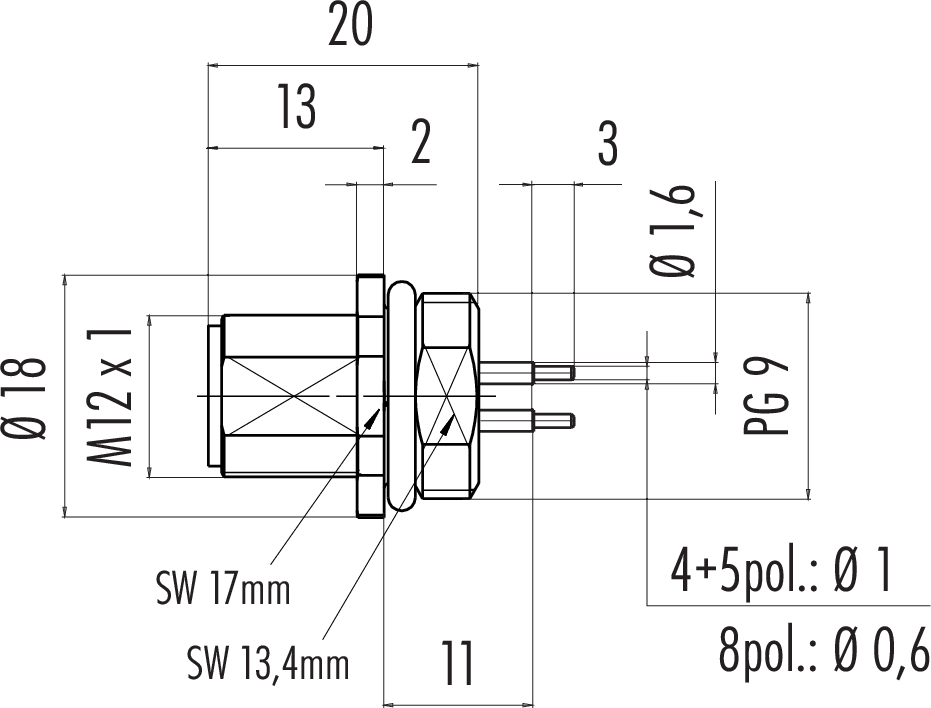 Polzahl: 8, nicht geschirmt, tauchlöten, IP68, UL, M16x1,5