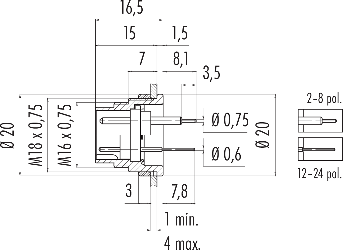 Polzahl: 16, nicht schirmbar, tauchlöten, IP40