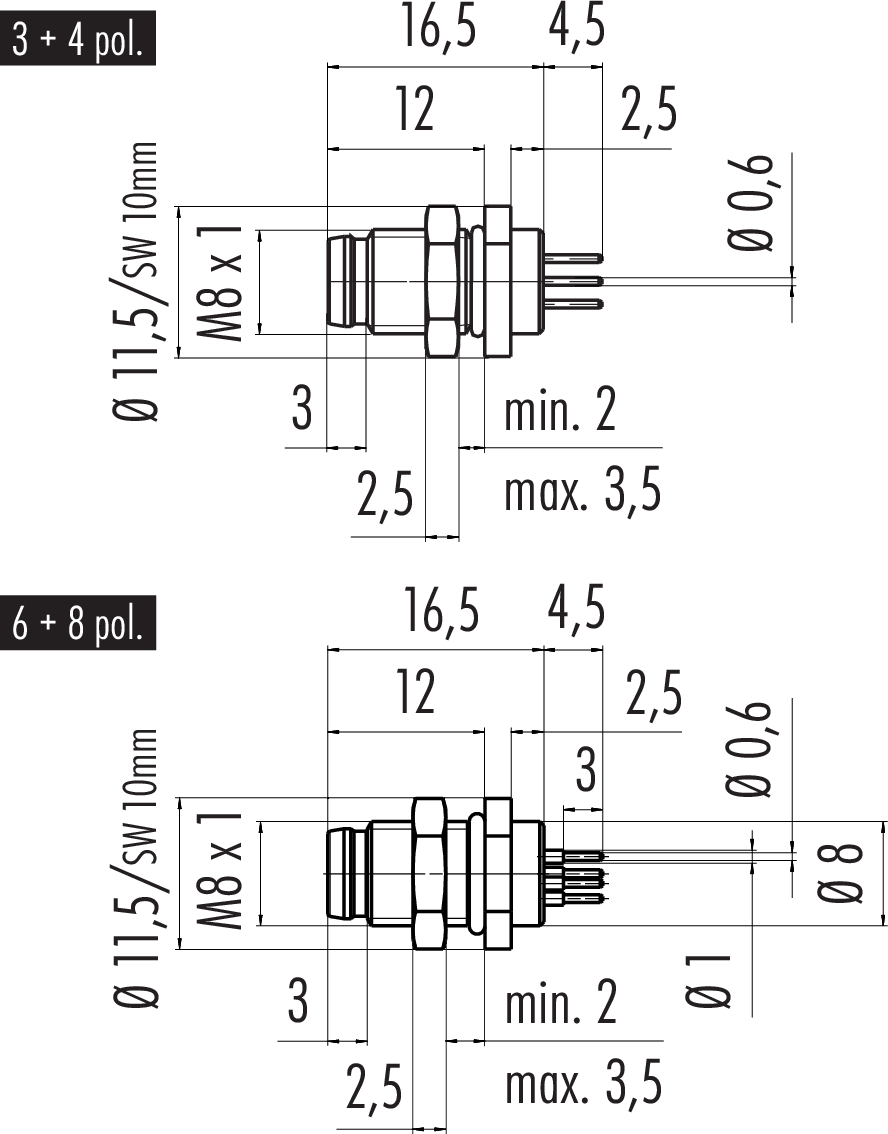 Polzahl: 6, schirmbar, tauchlöten, IP67