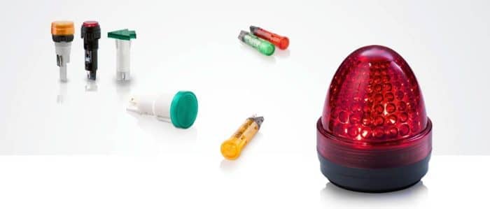 Signalleuchten sind Komponenten zum Anzeigen von Betriebszuständen. Es gibt Varianten mit LEDs oder Glimmlampen.